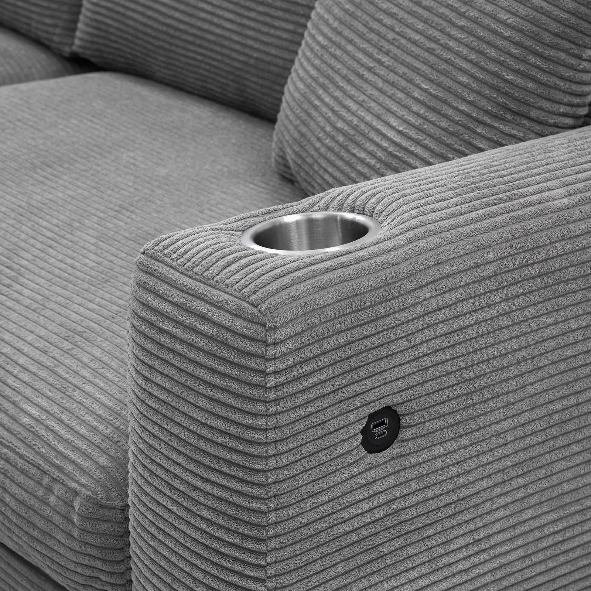El asiento extra ancho y la chaise longue ofrecen opciones de asiento lujosas y cómodas, con prácticos detalles como portavasos y puertos de carga USB. La tela de pana extra gruesa realza la comodidad y belleza del sofá. ¡Una excelente opción para el salón!