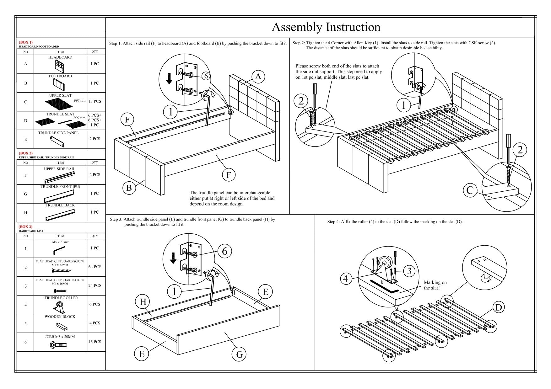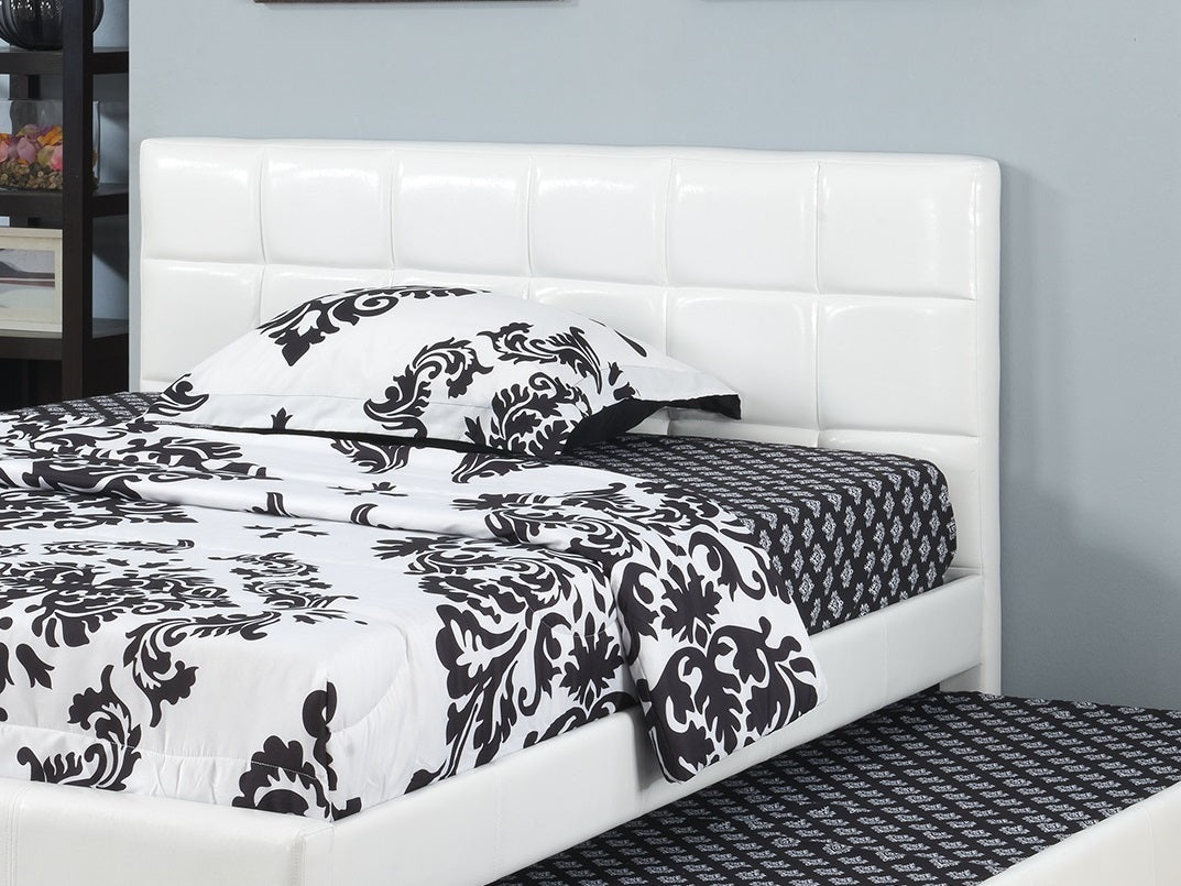 Description :- Style and function matters when it comes to this white colored faux leather upholstered Bedframe. It also includes a lower trundle with extra sleeping space for a guest. Now for a relaxing and lovely sleep, we bring to you this cozy option in the form of this massive comfortable full size bed With Trundle, White. This bed with a sleek and simple spread and square shape upholstered headboard maximize your rooms functions. Its modern and fashionable yet simple style makes this bed distinguished by the simply fashionable look. Dimensions : Twin Size Bed w Twin Trundle :- HB 39"H / FB 16"H w 12 WOODEN SLATS Listing includes - Twin Size Bed w Twin Trundle only.