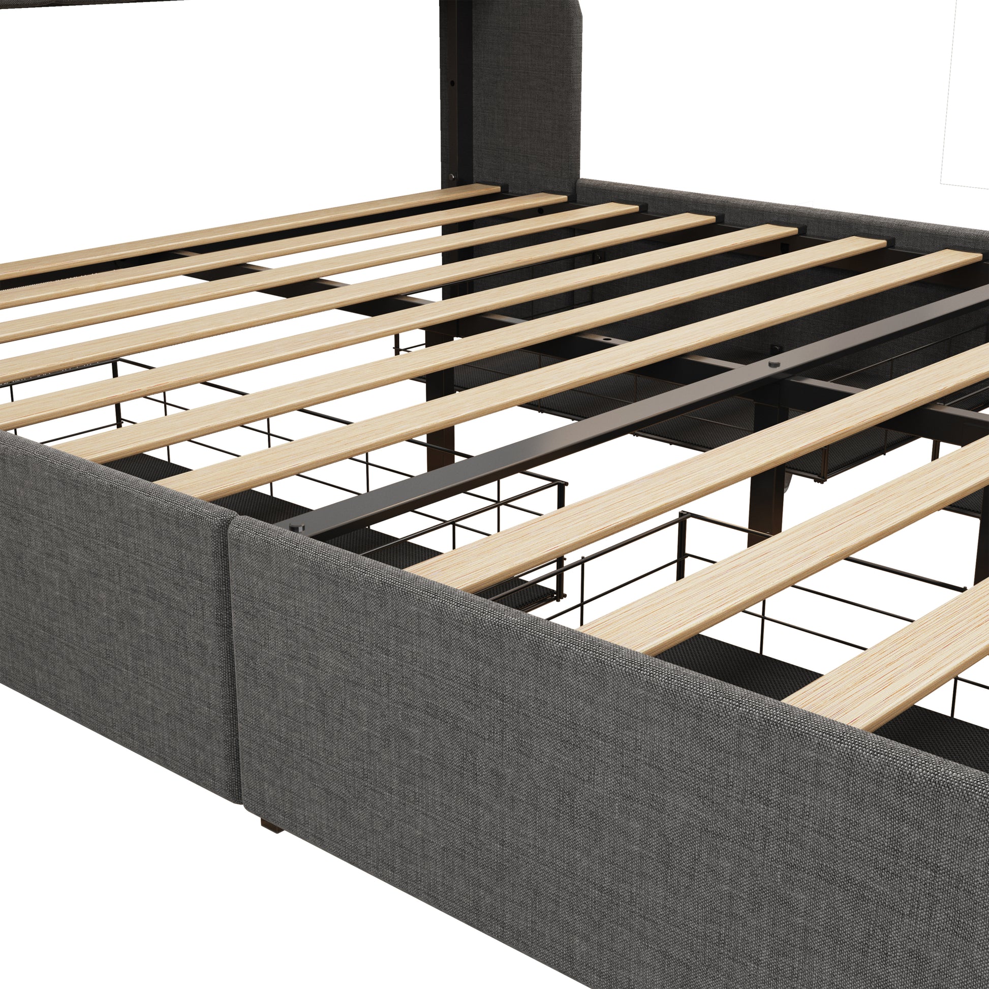Queen Size Bed Frame with LED, 4 Under-bed Portable Storage Drawers, Wings Headboard Design, Dark Grey