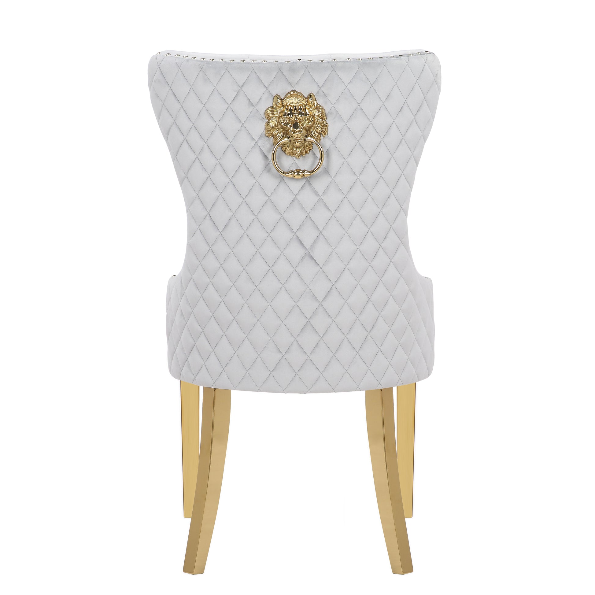 Sit down in comfort to eat with the stylish Simba velvet - Upholstered dining chairs providing the perfect feel and atmosphere complete with a sophisticated tufted finish with gold legs. The back is quilted to give a luxurious look. It has a golden lion head accent ring in the back. The Neil head application on the chair adds to the beauty of the chair.