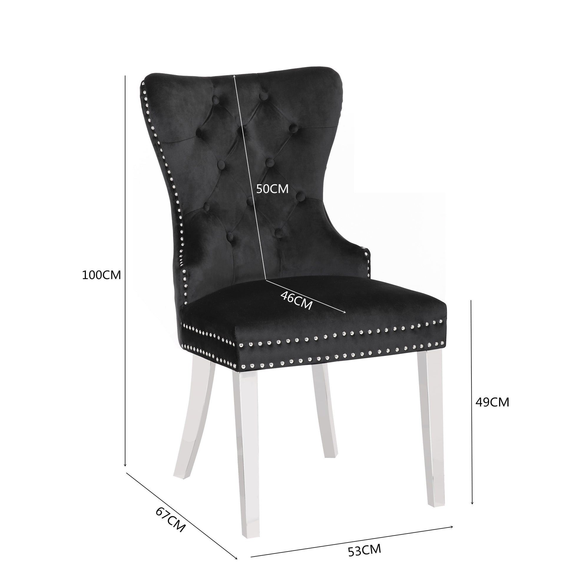 Sit down in comfort to eat with the stylish Simba velvet - Upholstered dining chairs providing the perfect feel and atmosphere complete with a sophisticated tufted finish with stainless steel legs. The back is quilted to give a luxurious look. It has a lion head accent ring in the back. The Nail head application on the chair adds to the beauty of the chair.