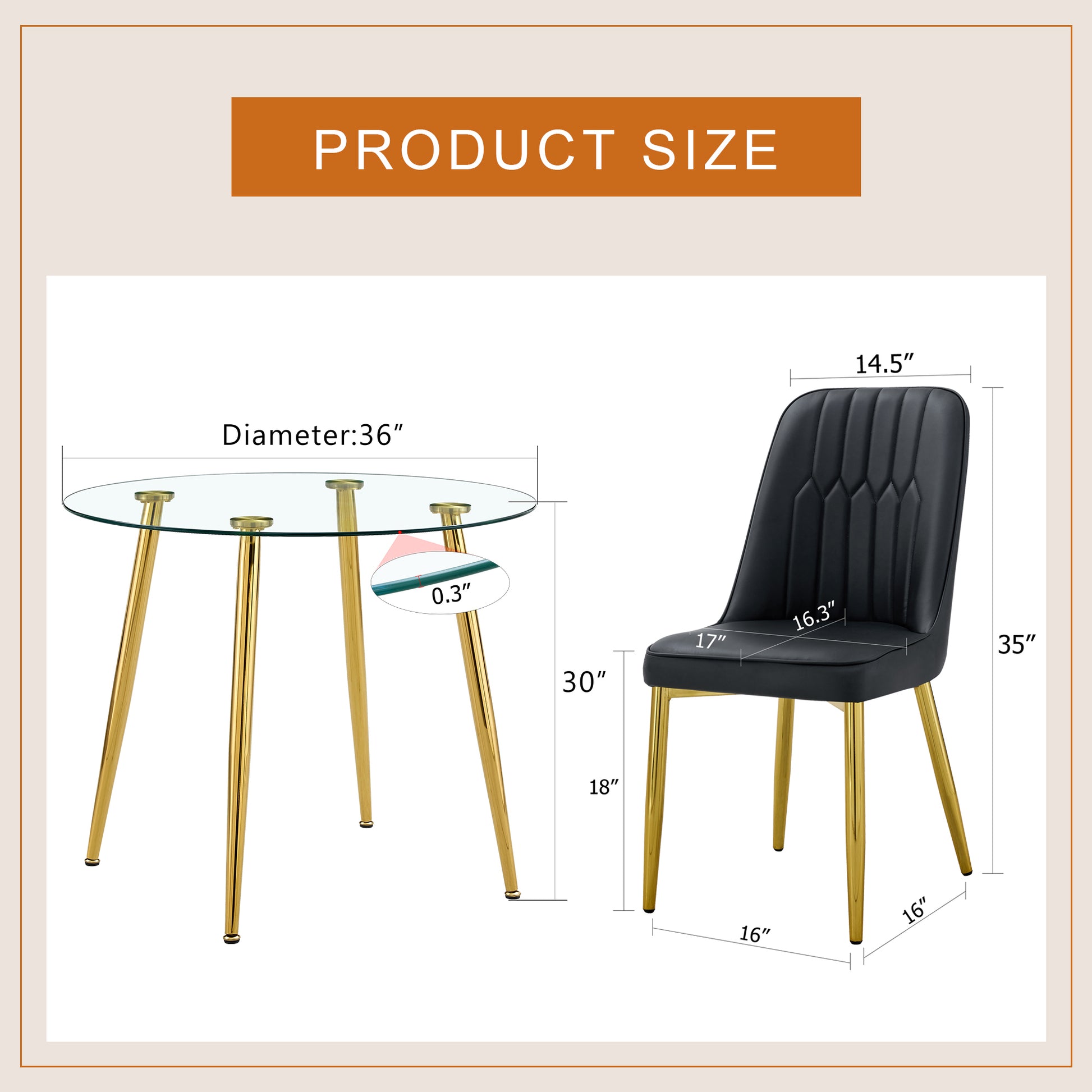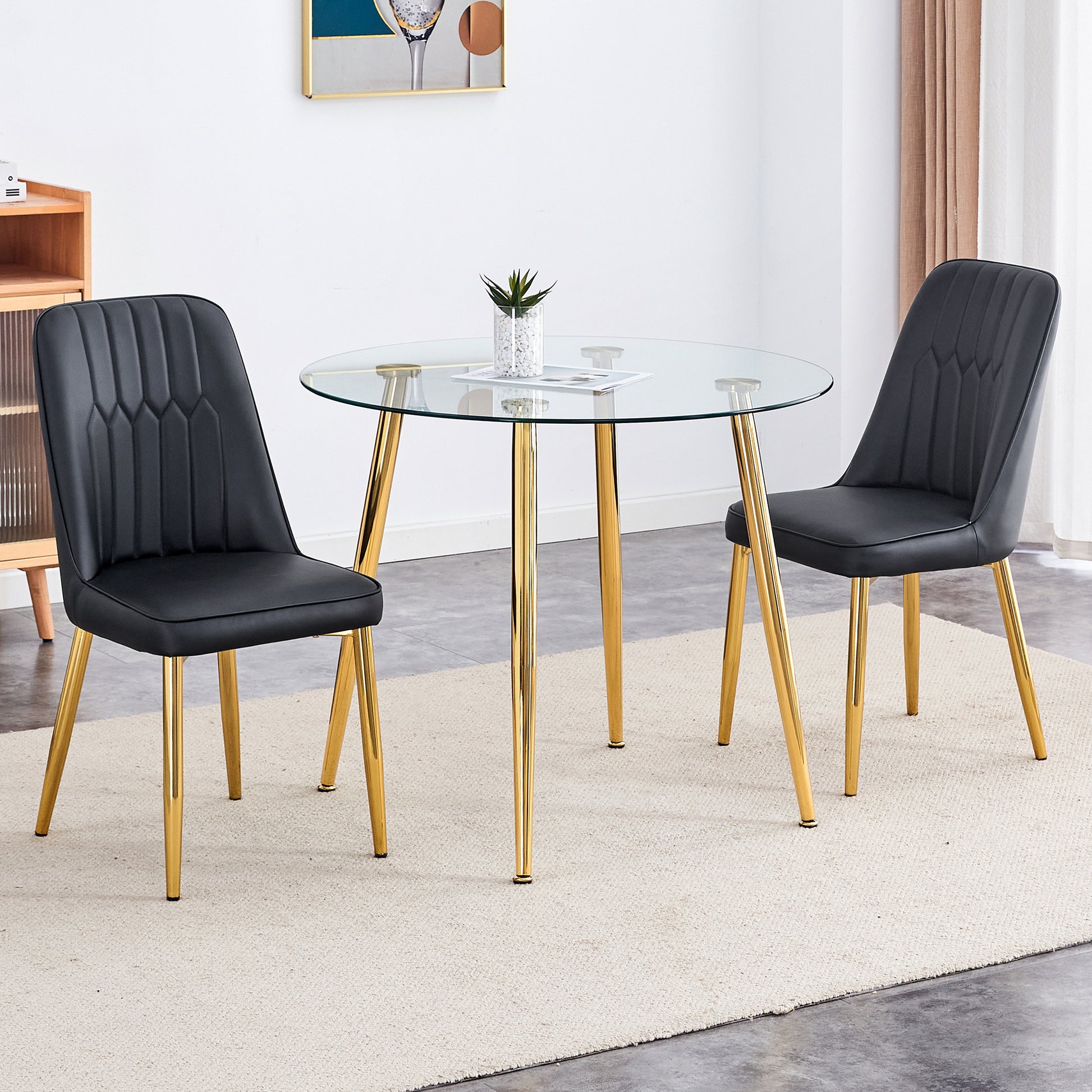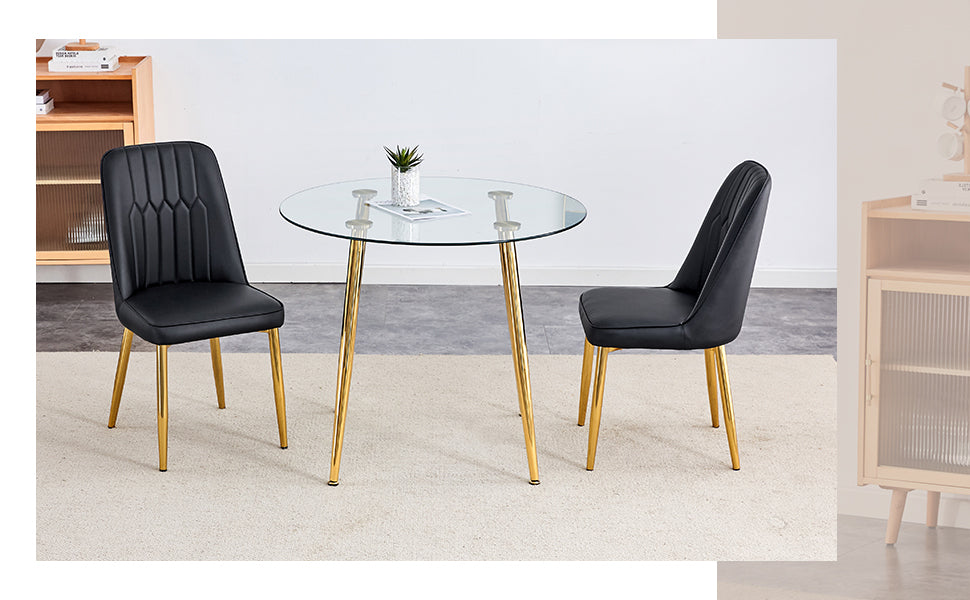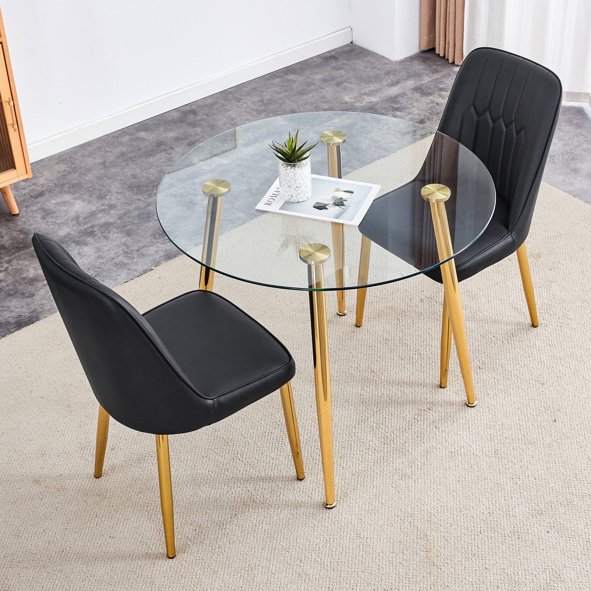 Table and chair set.36 Inch Diameter Modern Luxury Glass Dining Table and Chair Set - Gold Frame, Metal Legs.Two Black PU Chairs with Simple Line Designs On The Backrest.