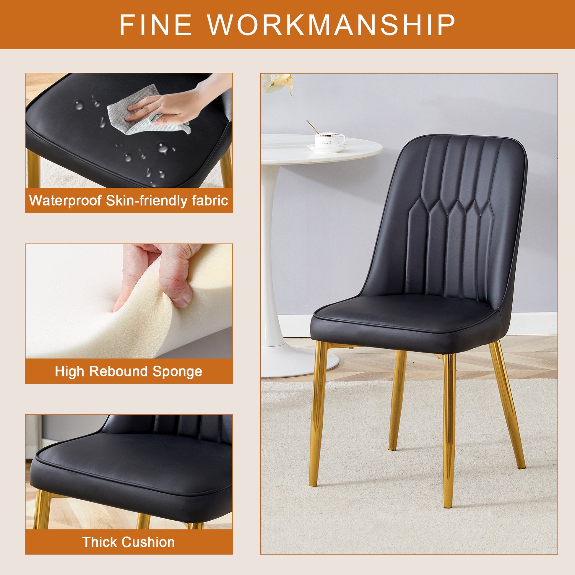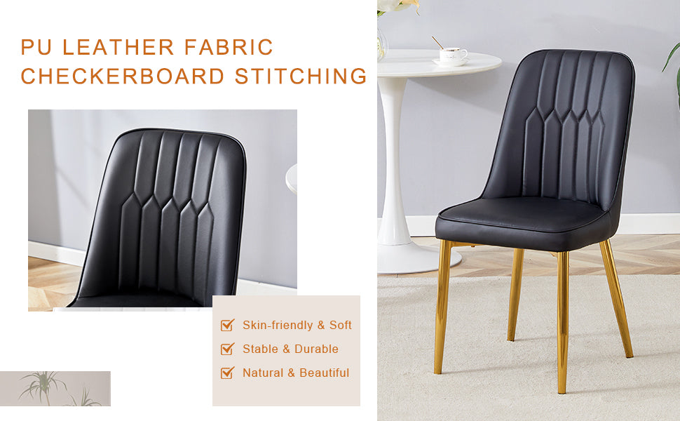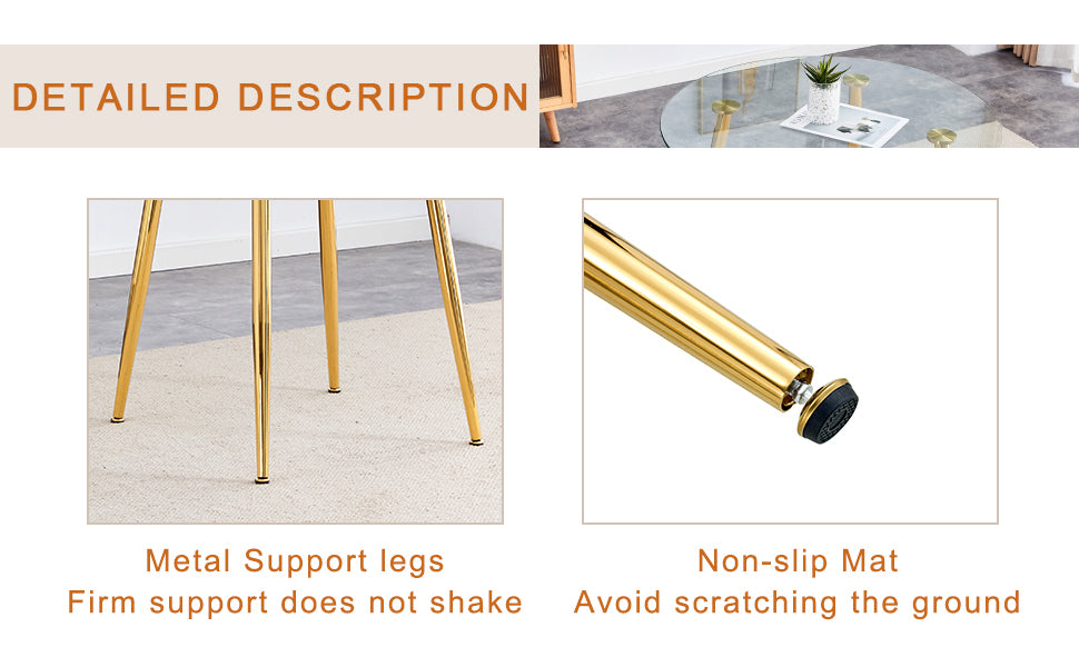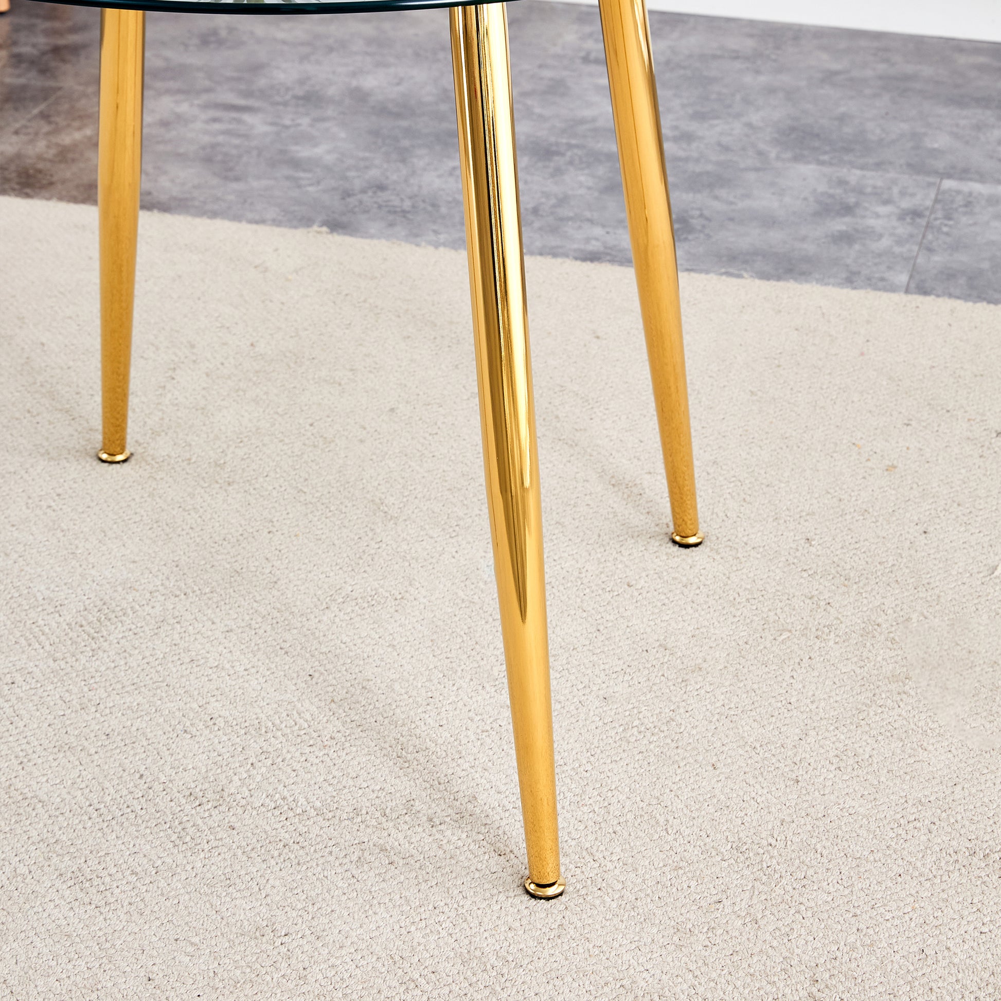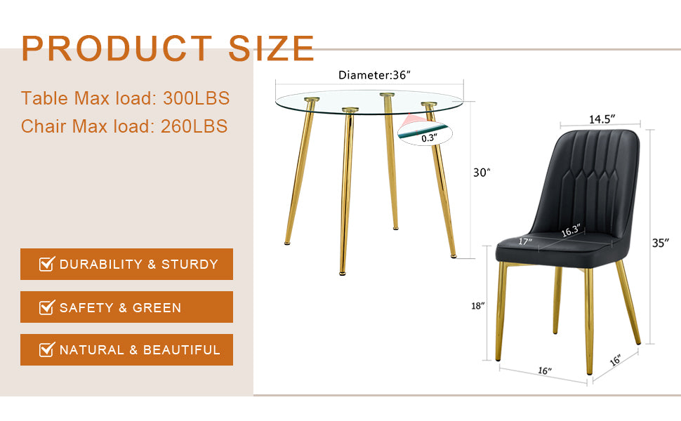 Table and chair set.36 Inch Diameter Modern Luxury Glass Dining Table and Chair Set - Gold Frame, Metal Legs.Two Black PU Chairs with Simple Line Designs On The Backrest.