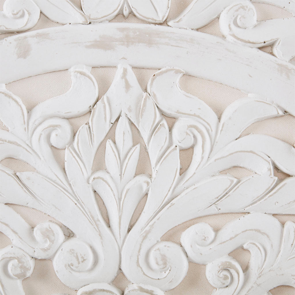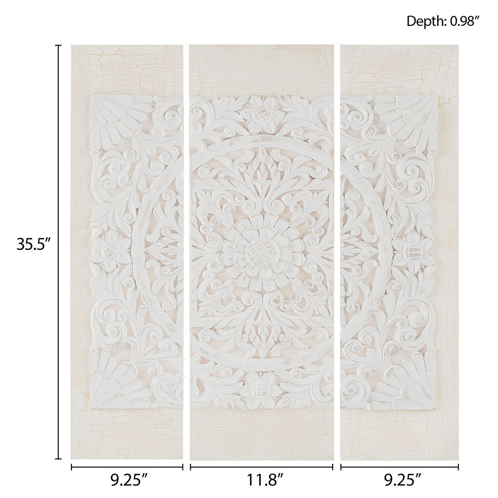 Hang our Madison Park Mandala Triptych 3-piece Dimensional Resin Canvas Wall Art Set on your wall to create a unique focal point in your space. An intricate carving design with the look and feel of wood is made from durable resin, then attached to the embellished canvas and set among each piece of this 3PC wall decor. The embellished canvas is featured in an off white washed tone and purposefully distressed, adding a rustic charm to the look. Globally inspired, this alternative wall decor adds a stunning texture and unique boho touch to any room in your home.