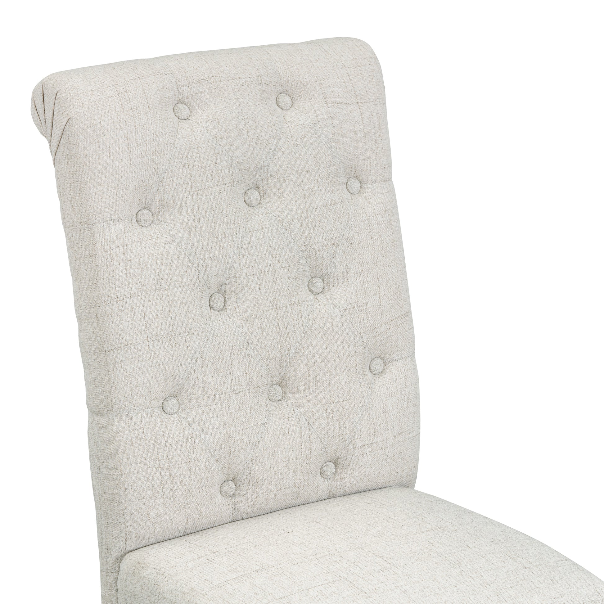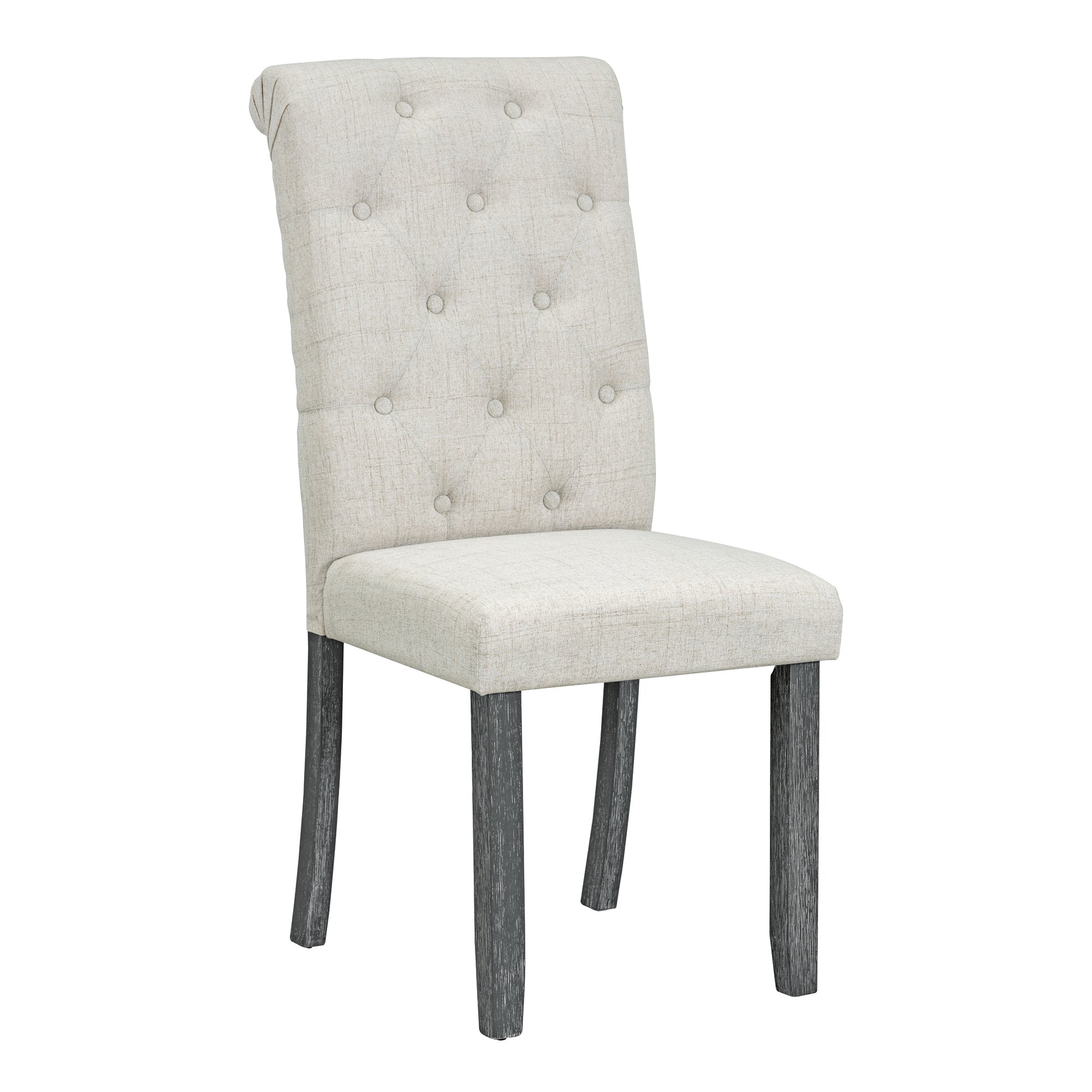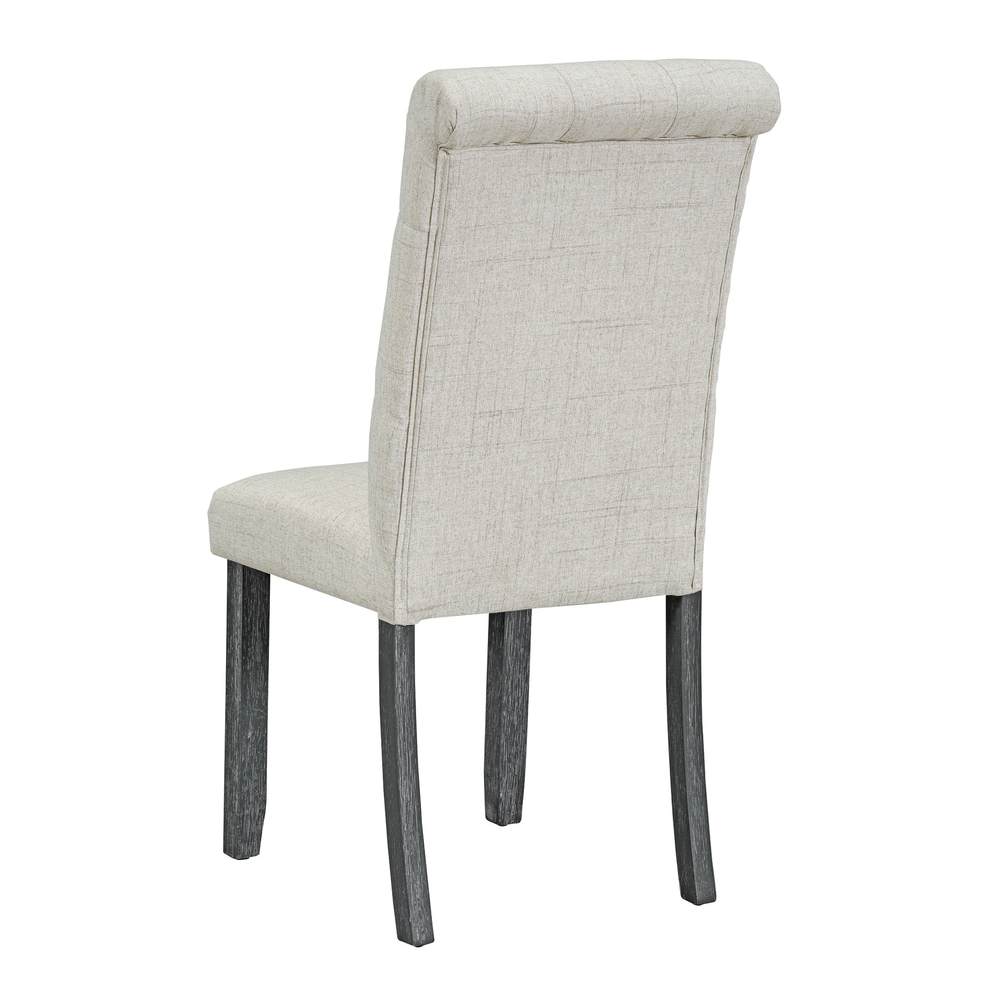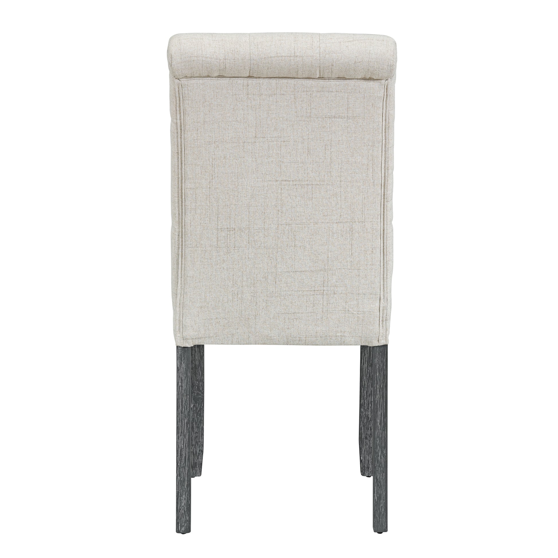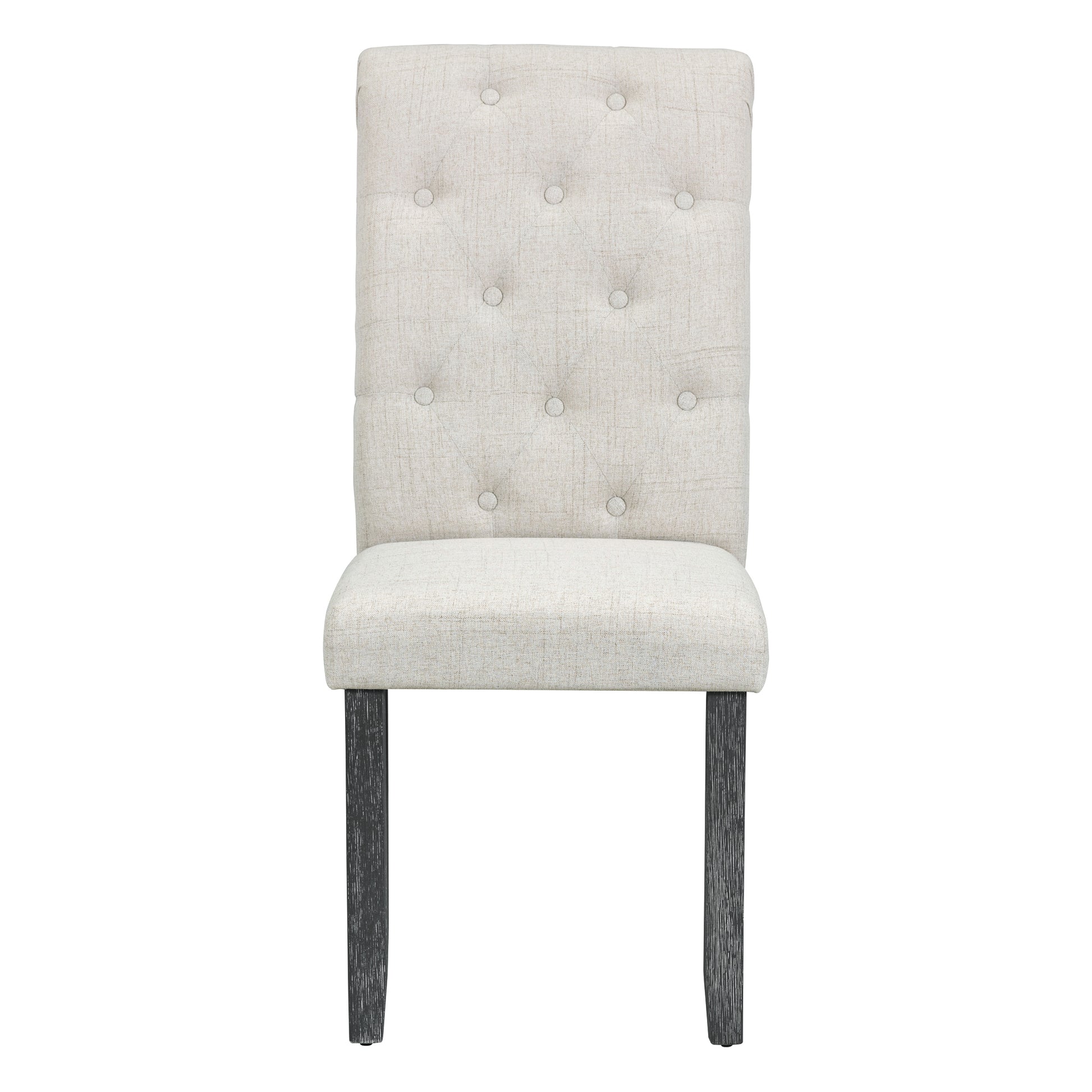 - The natural wood wash and grey finish add a distinctly rustic look that easily updates any household. Special symmetrical pattern design for table legs and button-tufting design of the seating set undoubtedly showcase a classic look, featuring an elegant and retro flair. Thick upholstered backrests of chair sets are in line with ergonomic design, thus bringing superb comfort. Whether used for chic dinner parties or casual family dinners, the dining set is sure to elevate any dining experience.